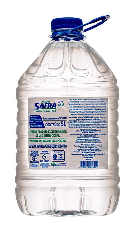 O Álcool 70° 5L da Safra é um desinfetante líquido eficaz para higienização de superfícies e mãos, com 70% de concentração (INPM), matando germes, vírus e bactérias.